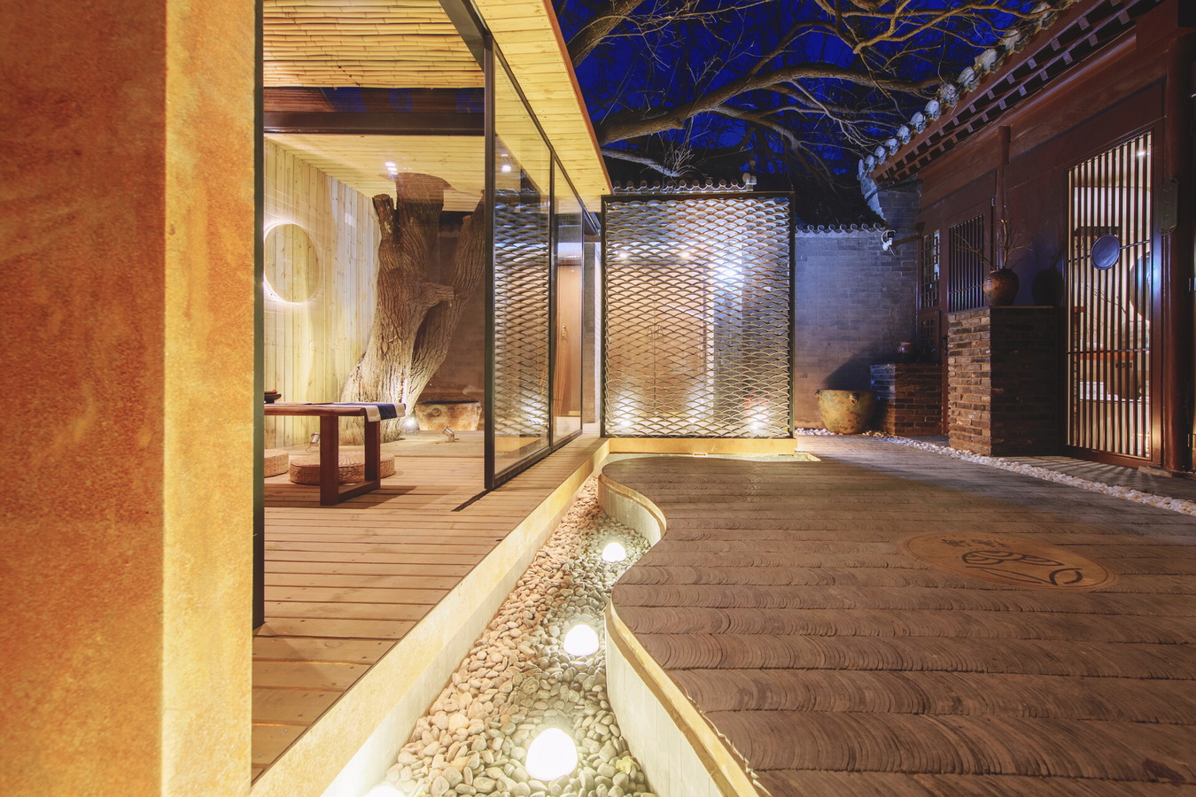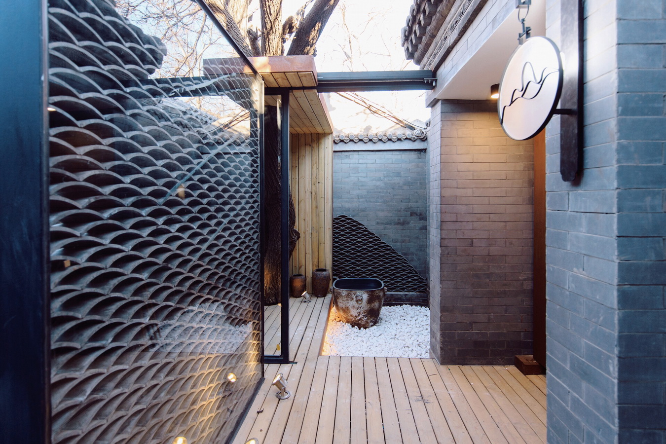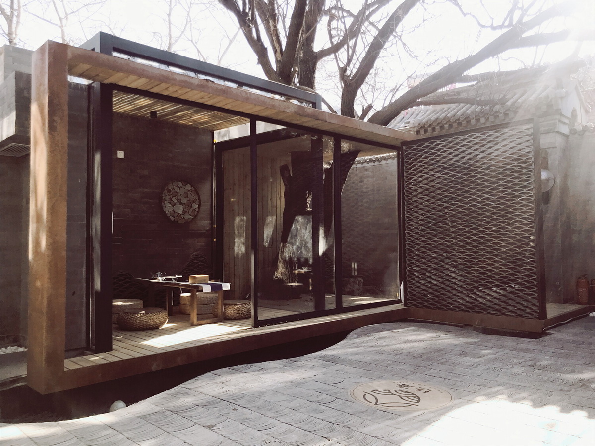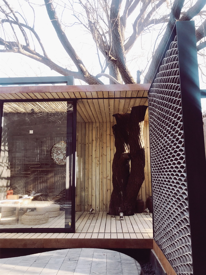 小院中大樹(shù)與茶室的媾和形成全院的核心,通過(guò)一個(gè)連續(xù)轉(zhuǎn)折的形體將入口、茶室與大樹(shù)等要素整合在一起,形成玄關(guān)、東南角樹(shù)院和茶室空間,選擇銹蝕鋼板和防腐木板兩種本身帶有時(shí)間沉淀感的材料與建筑主體在色彩與氣氛上相契合,是新與舊的融合,并以一個(gè)透明與儀式性的姿態(tài)言說(shuō)了一種不同于西方街道廣場(chǎng)式的「庭院公共生活」:一種以親近自然為主旨的公共生活。