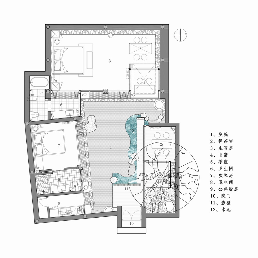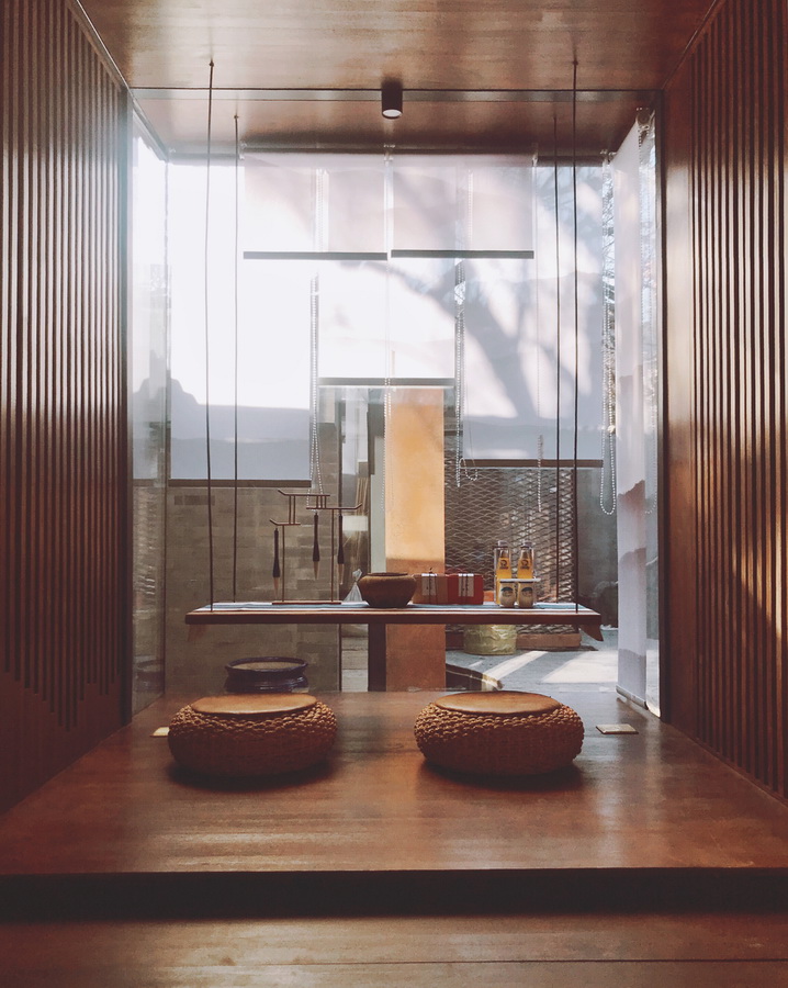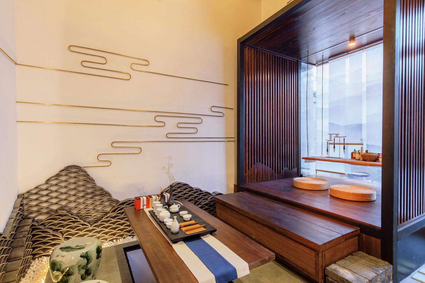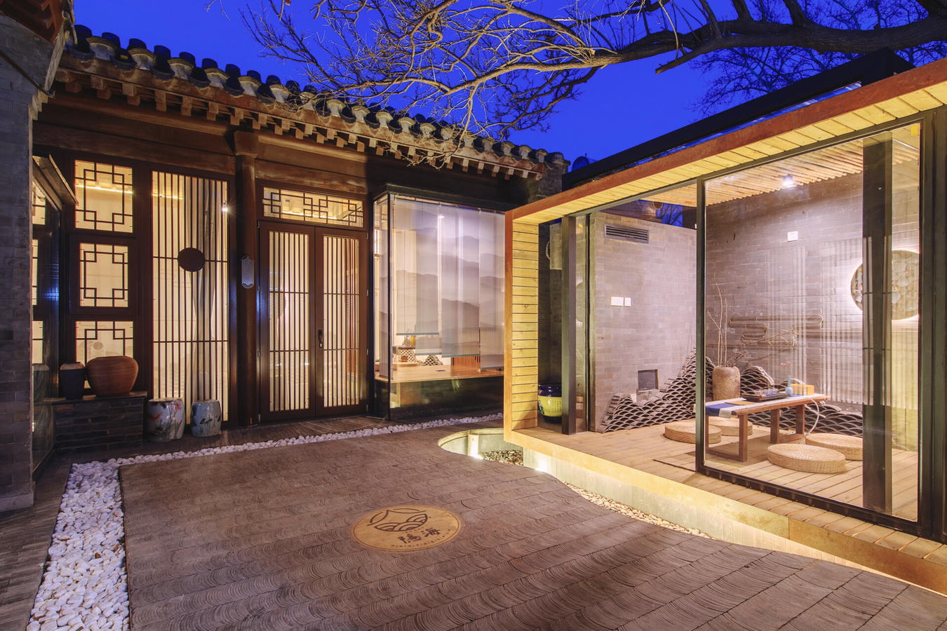 小院中大樹(shù)與茶室的媾和形成全院的核心,通過(guò)一個(gè)連續(xù)轉(zhuǎn)折的形體將入口、茶室與大樹(shù)等要素整合在一起,形成玄關(guān)、東南角樹(shù)院和茶室空間,選擇銹蝕鋼板和防腐木板兩種本身帶有時(shí)間沉淀感的材料與建筑主體在色彩與氣氛上相契合,是新與舊的融合,并以一個(gè)透明與儀式性的姿態(tài)言說(shuō)了一種不同于西方街道廣場(chǎng)式的「庭院公共生活」:一種以親近自然為主旨的公共生活。