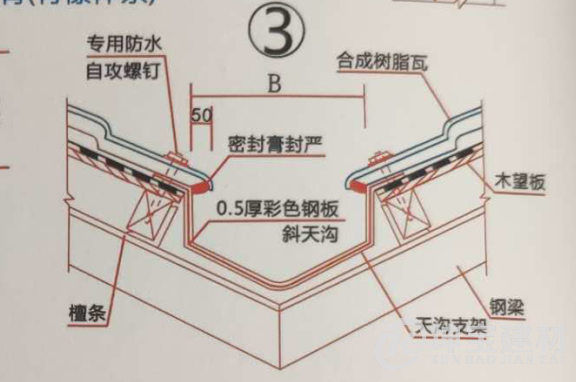 4 宜將主瓦挑入天溝內(nèi)50mm~120mm,并蓋住斜天溝水槽兩安裝定位邊。