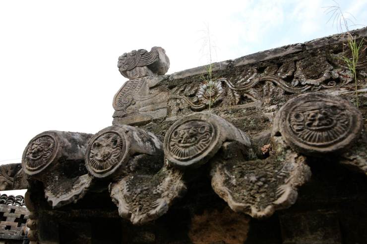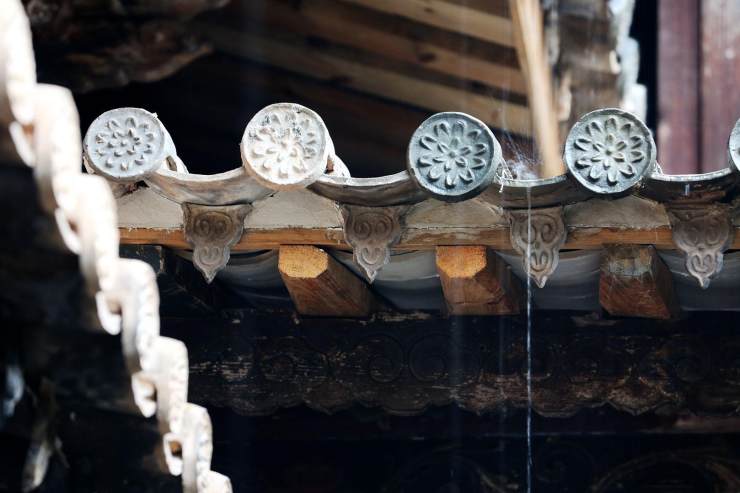 聰慧的中國工匠們利用樸實(shí)小瓦做出各種瓦花墻。杭州城永福寺的瓦花墻內(nèi)墻外風(fēng)光旖旎。晉中票號的東家們使用瓦花防盜,精湛技藝的匠人疊小瓦層層相扣成銅錢形,日常是票號的裝飾,任風(fēng)吹雨打,瓦自巋然不動。若是蟊賊攀爬,在不均勻受力作用下,瞬間分化瓦解。紅河建水的黃氏宗祠小青瓦對花成屋脊,別樣姿容。