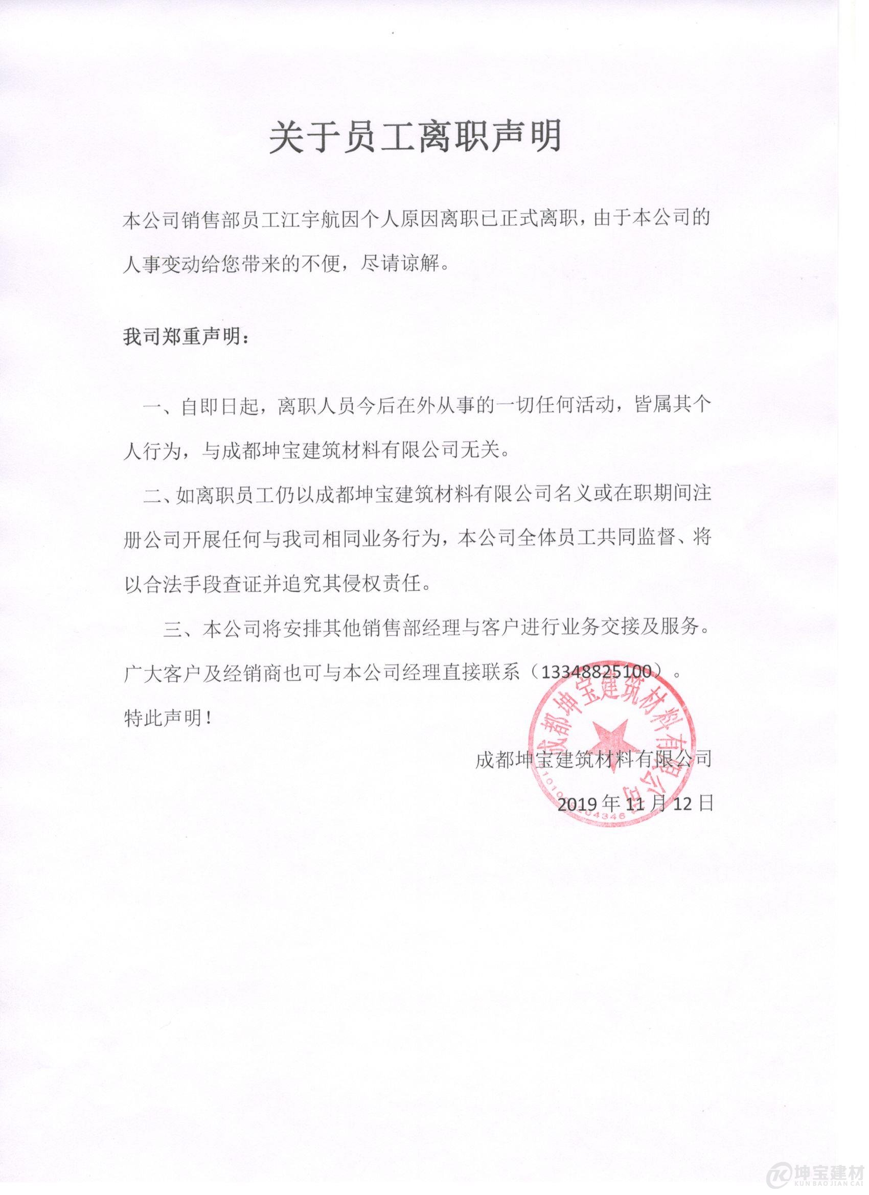 一、自即日起,離職人員今后在外從事的一切任何活動,皆屬其個人行為,與成都坤寶建筑材料有限公司無關(guān)。