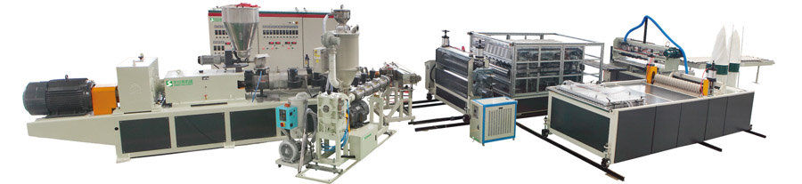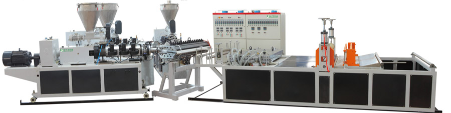 2.PVC層由SJZ80/156錐形雙螺桿擠出機(jī)生產(chǎn),ASA或者PMMA層由SJ50單螺桿共擠機(jī)擠出。設(shè)備還有T型模具,壓花輥,成型機(jī),切割機(jī)和堆放架組成;