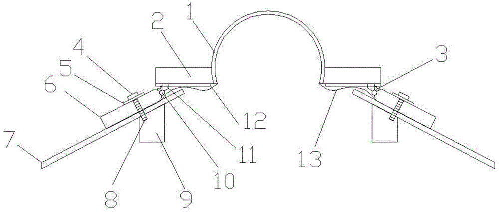 3.根據(jù)權(quán)利要求1所述的一種asa合成樹脂瓦(正脊瓦)連接結(jié)構(gòu),其特征在于:兩個所述連接塊(6)朝內(nèi)一側(cè)的底端均設(shè)置有防水膜(13)且兩個防水膜(13)的另一端分別與安裝座(1)的底端兩側(cè)固定連接。