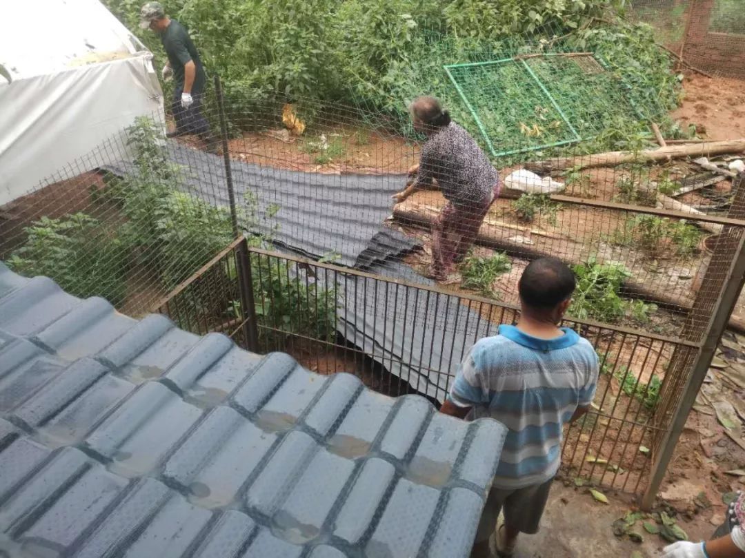 為了防止狗狗們跑掉,愛(ài)之家的所有工人們都冒雨出動(dòng),將后山圍了一圈鋼網(wǎng)。這些工人的年紀(jì)都在65歲以上,但他們干起活來(lái),卻是一點(diǎn)也不含糊。鋼網(wǎng)并不是長(zhǎng)久之計(jì),圍墻還得再修,一切只能等到雨停了。