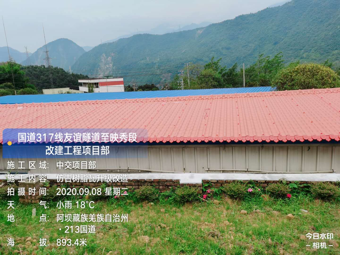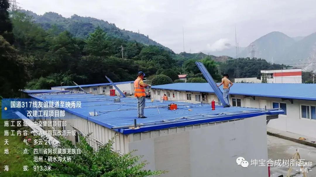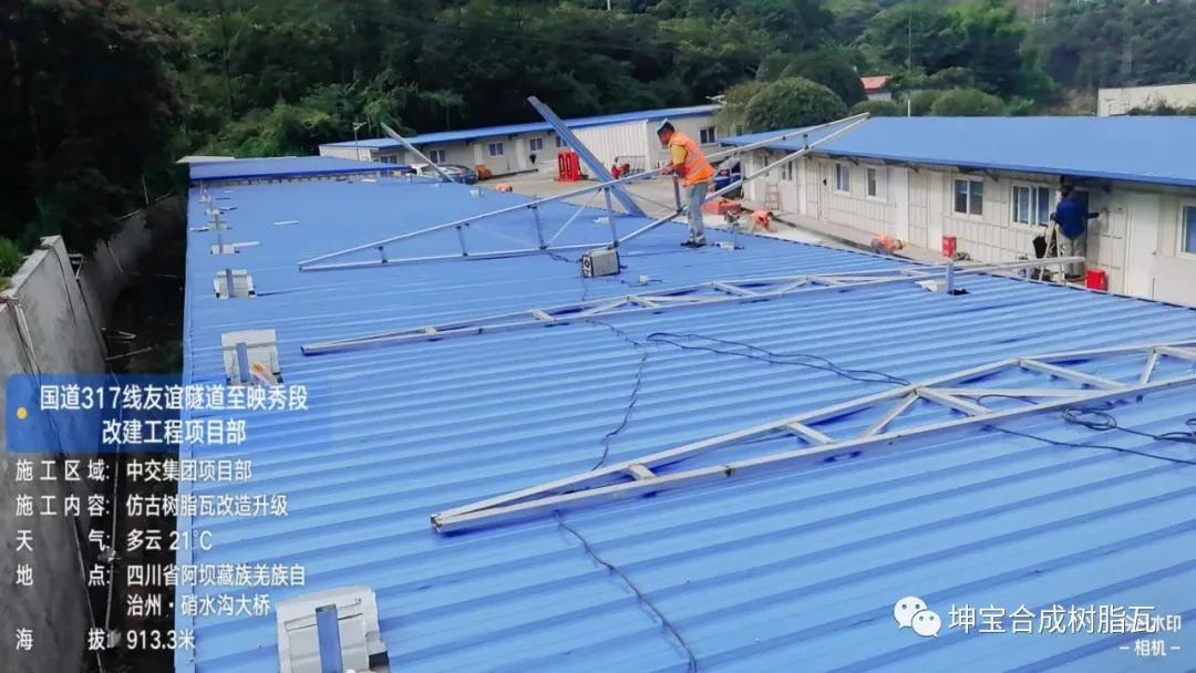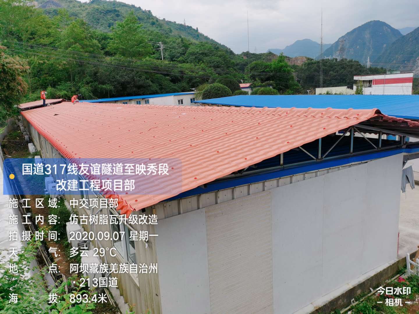 中交路橋集團(tuán)國(guó)道317線隧道至映秀段改建工程項(xiàng)目部屋頂加蓋樹脂瓦工程,接下來(lái)看樹脂瓦加蓋屋面的部分效果!